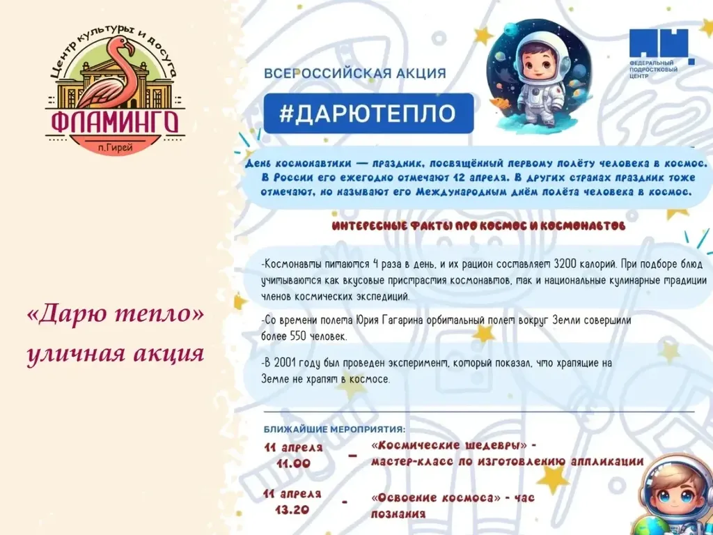 Сегодня на площади Центра культуры и досуга «Фламинго» состоялась тёплая и вдохновляющая акция «Дарю тепло», приуроченная ко Дню космонавтики! 🌠