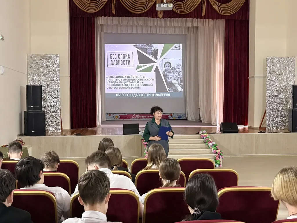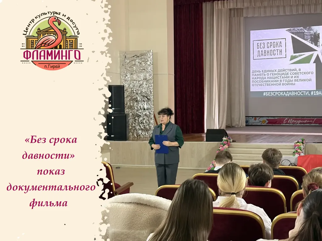 22 апреля в Центре культуры и досуга «Фламинго» состоялся показ документального фильма «Без срока давности» для учащихся средней школы. Картина посвящена трагическим событиям Великой Отечественной войны и рассказывает о преступлениях нацистов против детей на территории Краснодарского края.